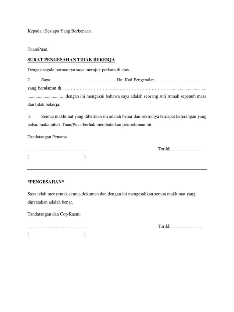 Surat pengesahan tidak bekerja suri rumah. Surat pengesahan tidak bekerja suri rumah pdf. Saya penama seperti bermaklumat di bawah dengan ini mengakui bahawa saya adalah seorang suri rumah dan tidak bekerja : Surat pengesahan tidak bekerja suri rumah. Download & view surat pengesahan tidak bekerja as pdf for free. 350 lampiran d surat akuan saya pn sakhilah binti shahkat ali. Dengan ini mengakui bahawa saya adalah seorang suri rumah sepenuh masa. Surat pengesahan tidak bekerja suri rumah. Related posts to contoh surat pengesahan pendapatan suri rumah . 19 contoh surat akuan sumpah pasangan tidak bekerja.